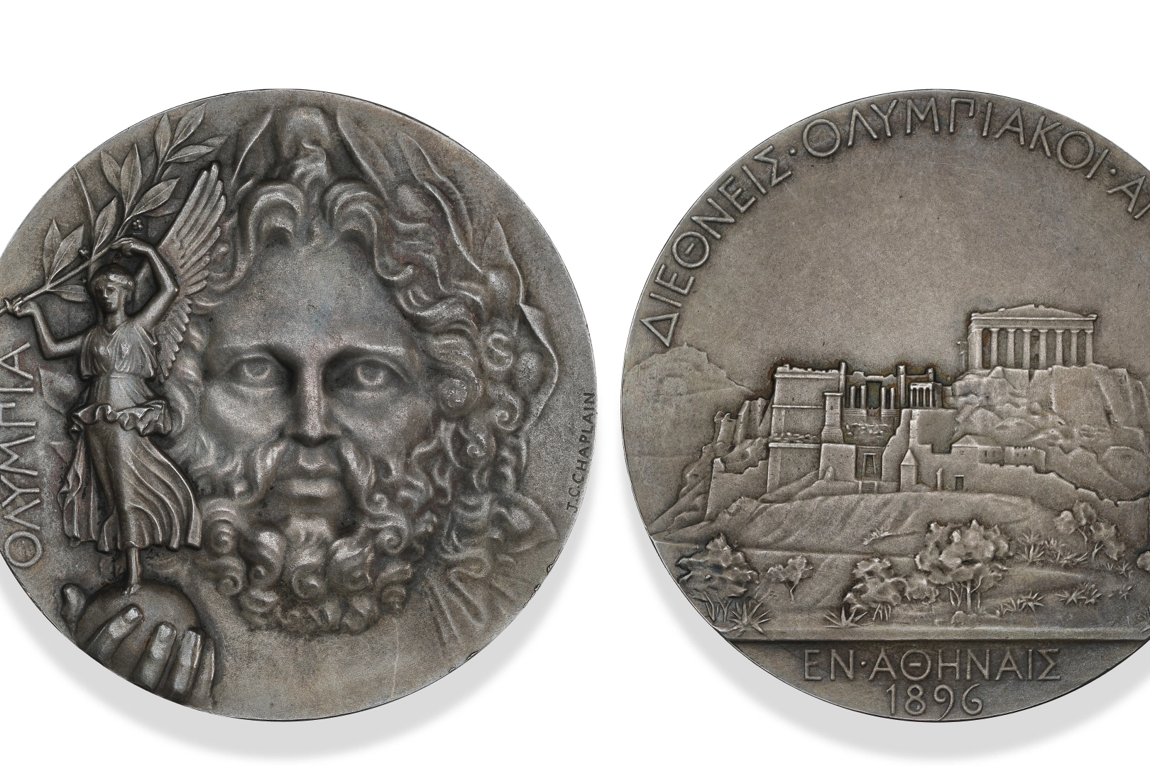 Akropolis ve Parthenon tasviri Yunanca yazıt: “Διεθνείς Ολυμπιακοί Αγώνες – Αθήναι 1896” (Uluslararası Olimpiyat Oyunları – Atina 1896)