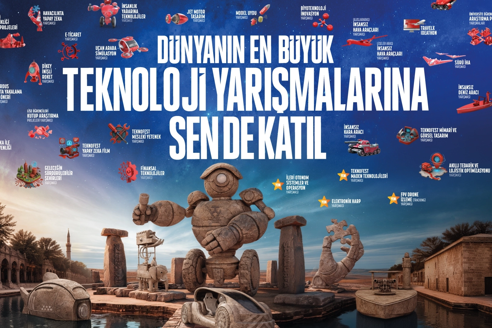 T3 Vakfı ve T.C. Sanayi ve Teknoloji Bakanlığı ana yürütücülüğünde, Türkiye’nin önde gelen teknoloji şirketleri, kamu, medya kuruluşları ve üniversitelerin destekleriyle düzenlenen dünyanın en büyük havacılık, uzay ve teknoloji festivali TEKNOFEST, 2026 yılında Şanlıurfa’da teknoloji severlerle buluşmaya hazırlanıyor. Festival coşkusunu ülkemizin her köşesine ulaştıran ve "ilklerin tek festivali" TEKNOFEST’in teknoloji yarışmalarına katılmak için www.teknofest.org adresinden başvurularınızı yapabilirsiniz.