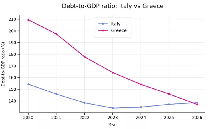 Grafik, 2020-2026 dönemi boyunca İtalya ve Yunanistan'ın kamu borcu/GSYİH oranını karşılaştırmaktadır.