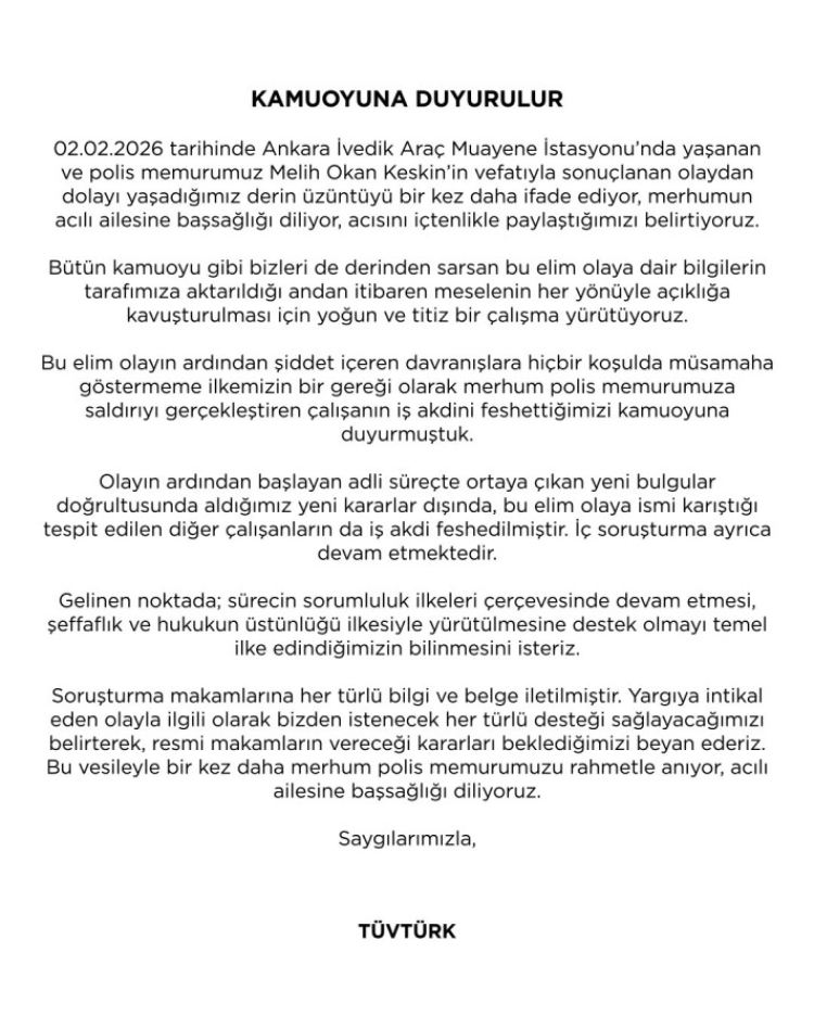 TÜVTÜRK'ten yapılan açıklamada, 2 Şubat'ta Ankara İvedik Araç Muayene İstasyonunda yaşanan ve polis memuru Keskin'in vefatıyla sonuçlanan olay nedeniyle derin bir üzüntü yaşandığı belirtildi.
