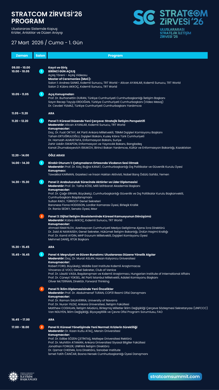 İletişim Başkanlığı ev sahipliğinde, 37 ülkeden ve 5 uluslararası kuruluştan 159 üst düzey ismin katılacağı Uluslararası Stratejik İletişim Zirvesi (Stratcom), 27-28 Mart'ta İstanbul'da başlıyor.